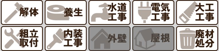 ダイニングキッチン工事、風呂・洗面取付工事、トイレ工事、全室内装工事、屋根・外壁塗装工事 ※30坪 想定