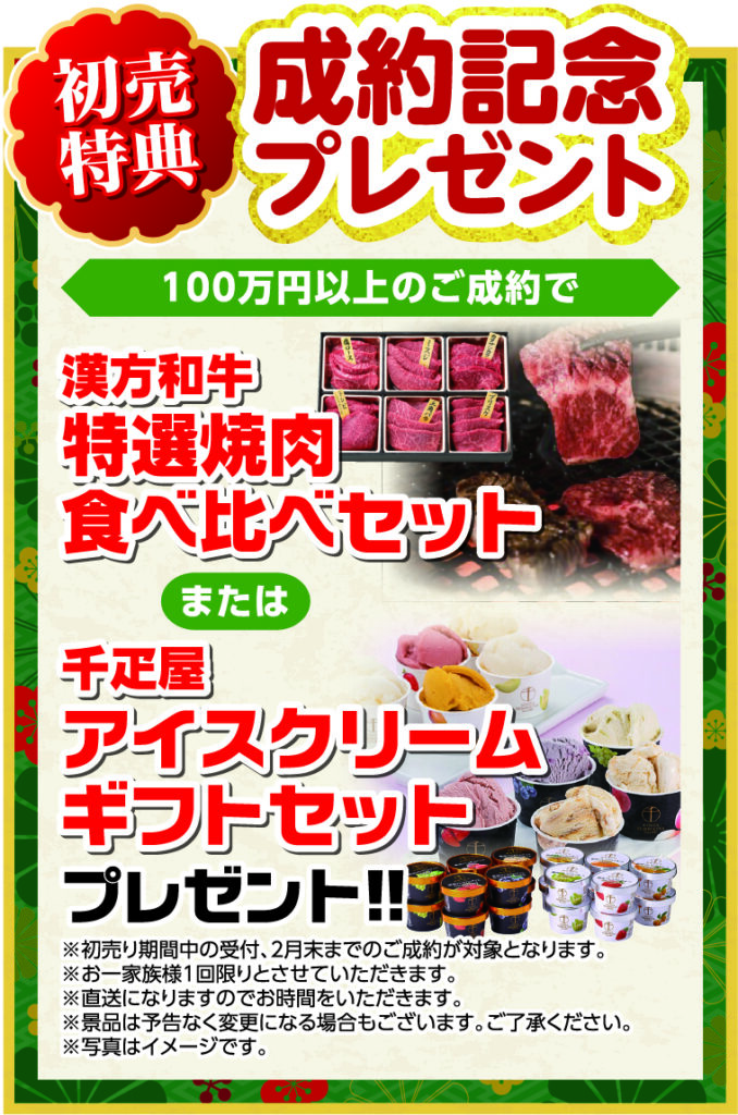 成約記念プレゼント:100万円以上のご成約で、焼肉食べ比べセットまたはアイスクリームギフトセットプレゼント!