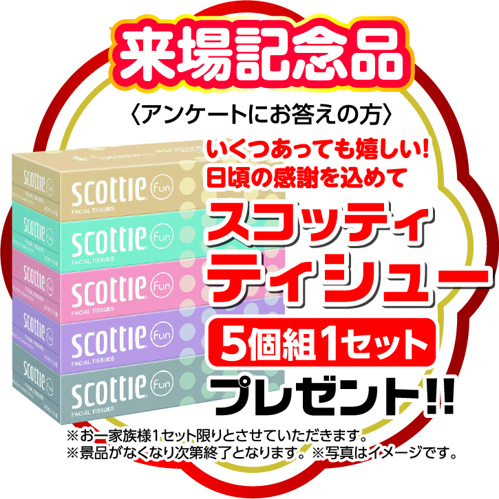 来場記念品:「スコッティティシュー」5個組1セットプレゼント!