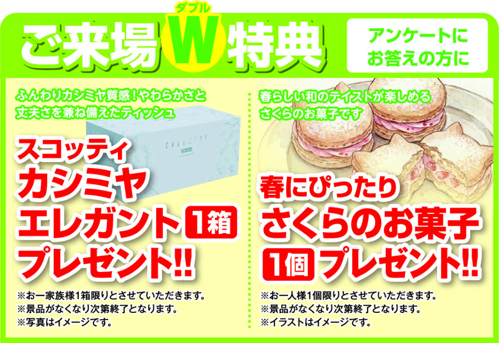 来場記念品:「スコッティカシミヤエレガント」1箱&「さくらのお菓子」1個 プレゼント!