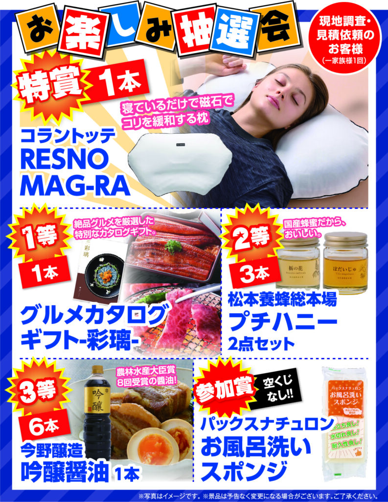 お楽しみ抽選会:現地調査・見積依頼のお客様にその場で当たる!